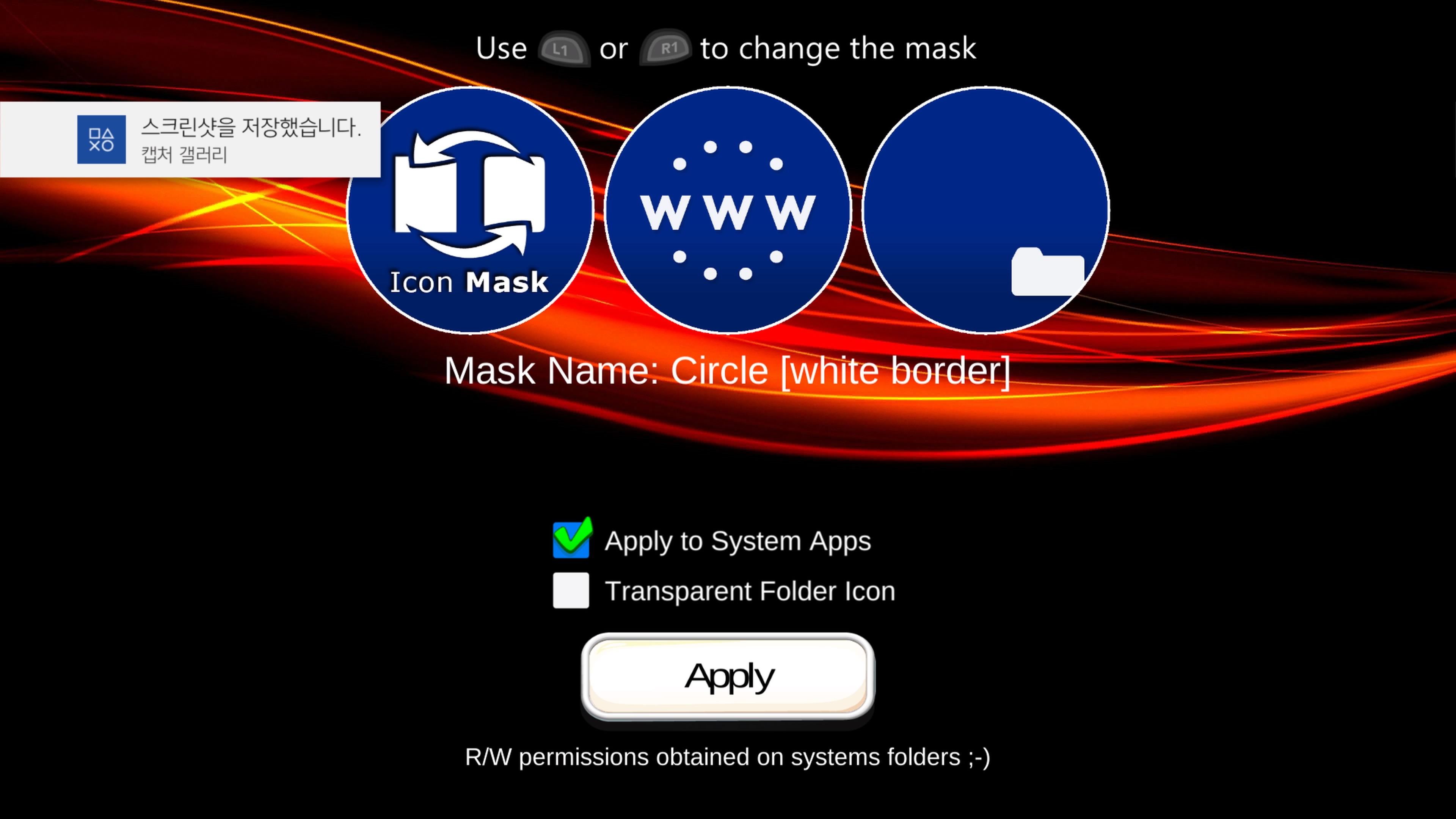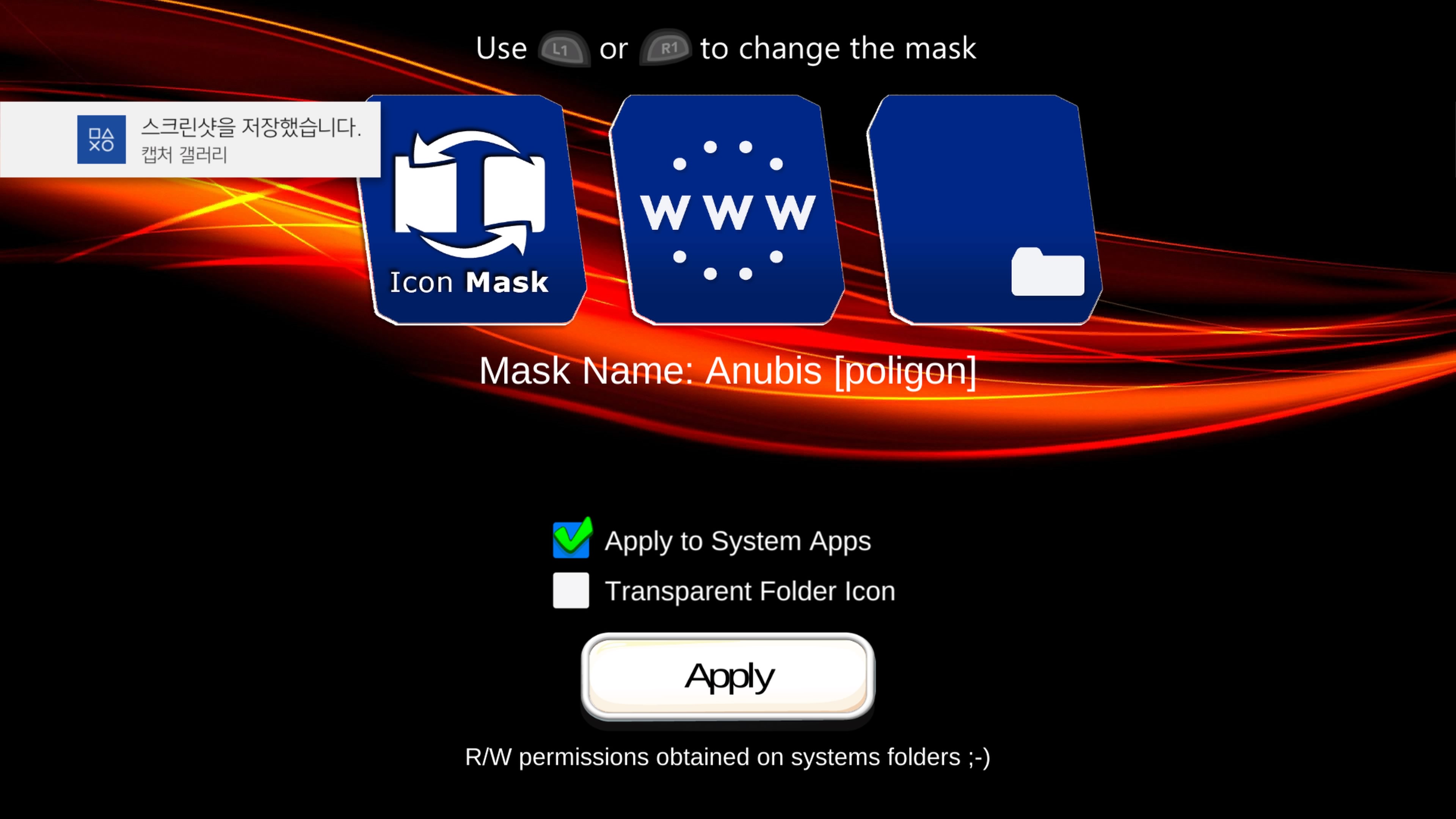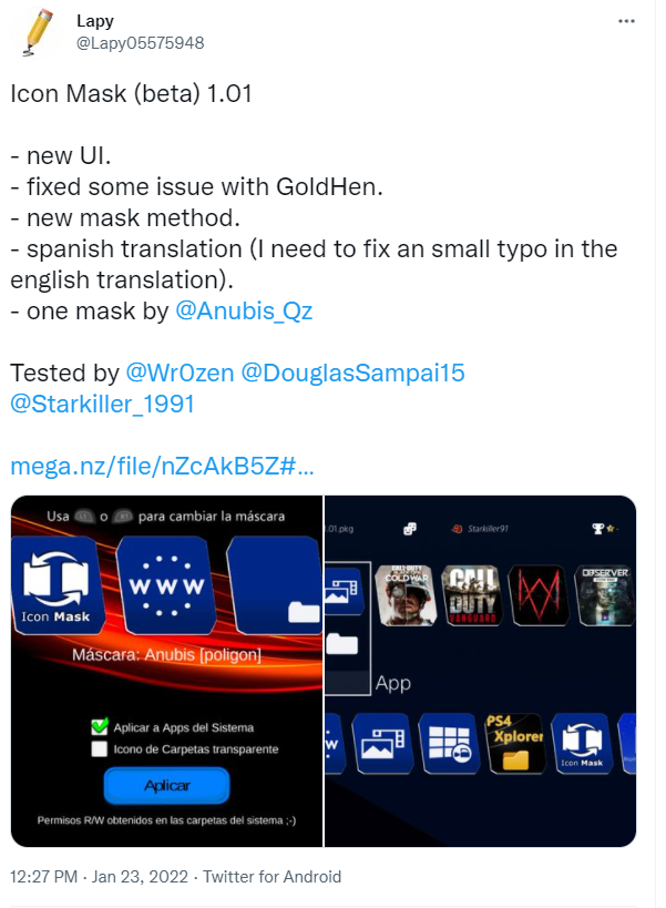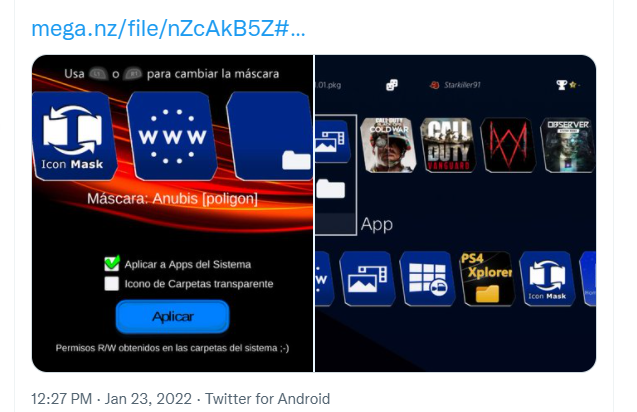 “Icon Mask (beta) 1.01 - new UI. - fixed some issue with GoldHen. - new mask method. - spanish translation (I need to fix an small typo in the english translation). - one mask by @Anubis_Qz Tested by @Wr0zen @DouglasSampai15 @Starkiller_1991 https://t.co